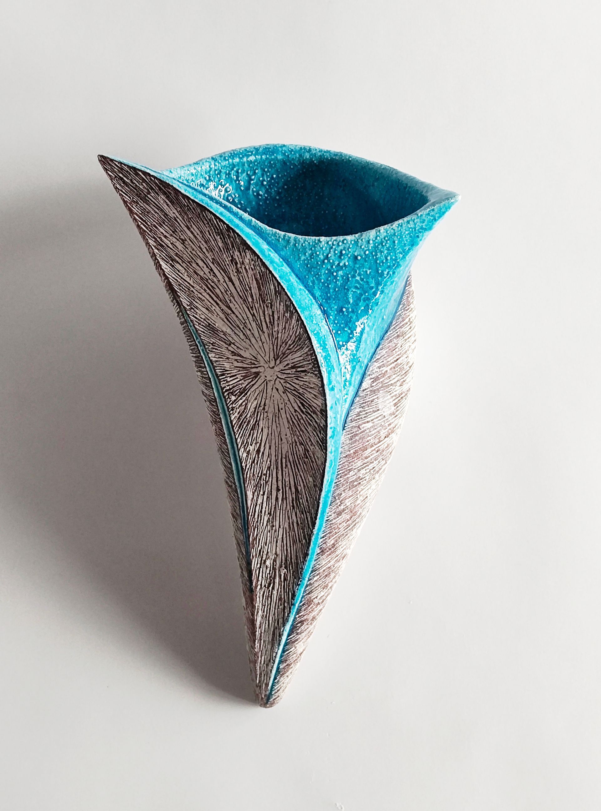 Within the realm of his experimental ceramics, Shinya fearlessly explores the capabilities of his chosen medium, infusing it with emotional depth and a sense of wonder. Exhibiting remarkable simplicity and elegant aesthetics, his creations inject a fresh perspective into the rich Japan's ceramic heritage. For Shinya, clay pulsates with life, becoming a conduit for expressing the very essence of existence. Employing a coil technique and working with three types of clay, he meticulously sculpts his ceramics, employing two slips to achieve the desired effect. Intricate surface carving bestows upon his works a distinctive texture and relief. To further enhance their allure, he adorns the interiors with a lustrous blue-glazed finish.